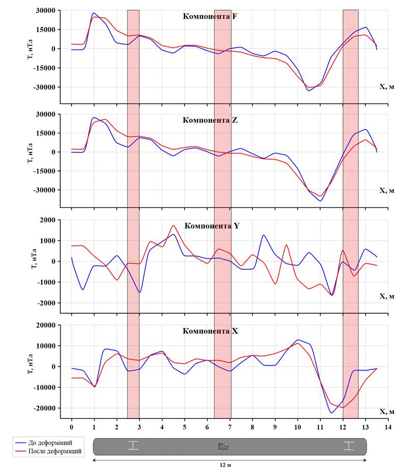 | Y | Before: Local minimum, the effects of the joints After: Increase in field values by 1500 nT, smoothing out the local minimum | Before: Absence of local anomalies After: The defect boundaries are manifested by local minima, with an increase of 500 nT | Before: Local minimum, the effects of the joints After: Displacement of extremes, an increase in their amplitude by 1000 nT |